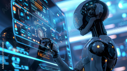 A sleek AI robot interacting with a virtual interface glows with neon lights, set in a futuristic environment.