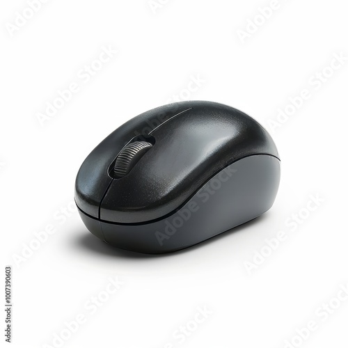A sleek black wireless computer mouse rests on a bright white surface, designed for comfortable navigation during work or leisure