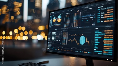 A sleek computer monitor displaying intricate data analytics with colorful graphs and metrics in a modern office setting.