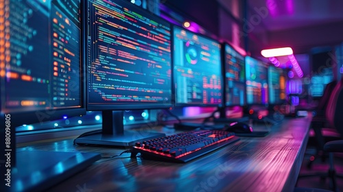 A sleek computer workstation with multiple monitors displaying colorful code in a modern, vibrant office setting.