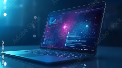 A sleek laptop displays a futuristic interface with dynamic data visualizations, charts, and code snippets.