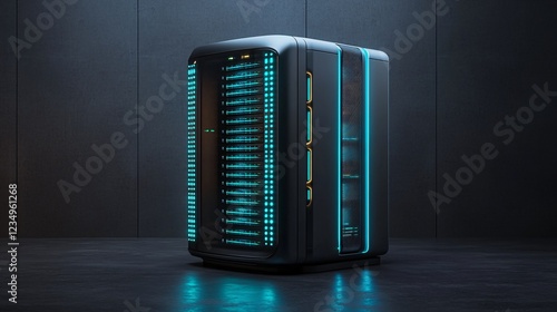 A sleek, modern computer server with neon blue lights, set against a dark background, emphasizing its high-tech design.