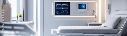A sleek modern hospital bedroom with minimalistic design and high-tech elements