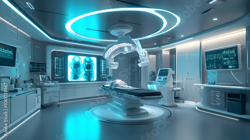 A sleek robotic operating room with glowing blue lighting and advanced medical machinery, representing innovation in surgical robotics and futuristic healthcare.