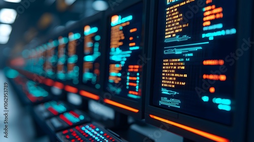 A sleek row of high-tech monitors displaying vibrant coding and data patterns in a modern digital environment.