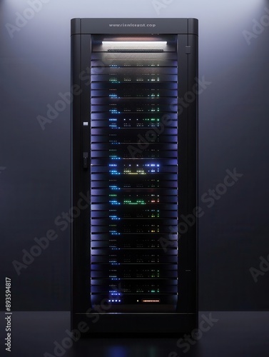 A sleek server rack glowing with vibrant lights, showcasing advanced technology in a modern data center environment.