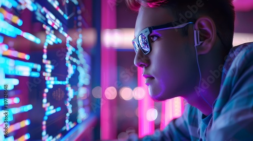 A sleek software engineer coding on a transparent screen in a neon-lit office style