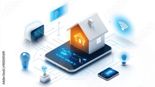 A smart home hub device surrounded by icons representing connectivity and automation, set against a white background. Emphasizing modern living and tech.