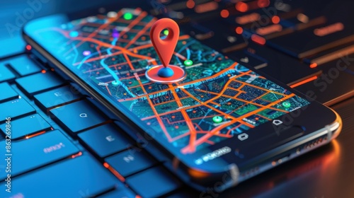 A smartphone displaying a 3D map with GPS navigation and a prominent red map pin. The phone rests on a keyboard, highlighting tech and navigation themes.