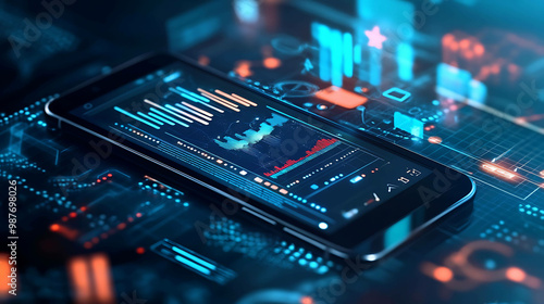A smartphone displaying a futuristic data screen with graphs and charts.