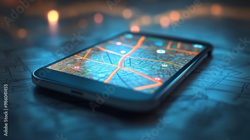 A smartphone displaying a vibrant map interface, illuminated against a dark background, suggesting navigation and exploration.
