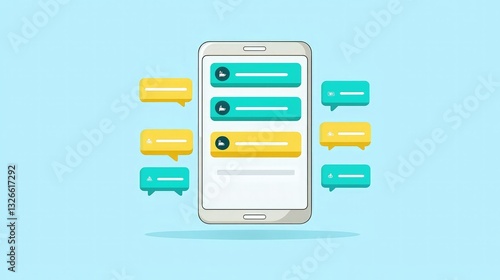 A smartphone displaying chat messages in vibrant speech bubbles against a light blue background.