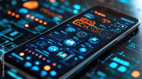 A smartphone displaying futuristic data analytics and digital interfaces.