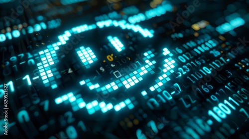 A smiling face icon formed from binary code, set against a background of dark binary digits.