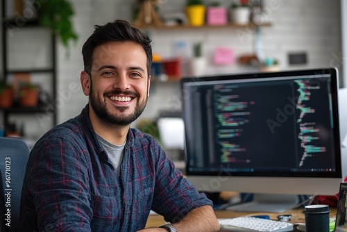 A smiling programmer works at a desk. This image is perfect for illustrating articles on web development, coding, and technology.