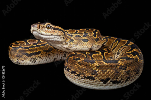 A snake is curled up on a black background. The snake is brown and black in color. The snake appears to be resting or sleeping. Black background
