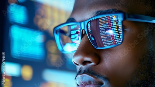 A software developer deeply focused on coding, surrounded by multiple screens and modern office tech, with code reflecting in their glasses