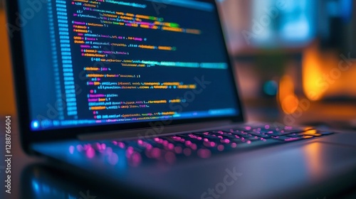 A software developers keyboard and code-filled laptop screen on a desk.
