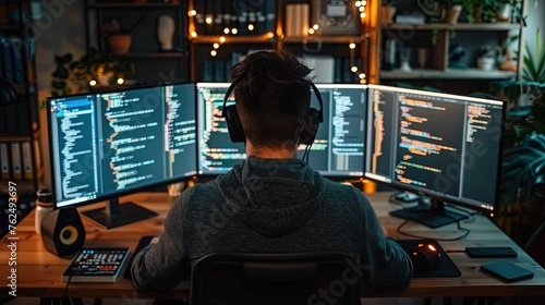 A software engineer debugging code on multiple monitors in a tech-filled office, representing concentration and problem-solving skills