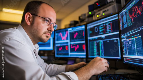 A software engineer or hacker analyzing system data on multiple screens in a secure data center, symbolizing complex problem-solving and high-level security operations. Suitable fo