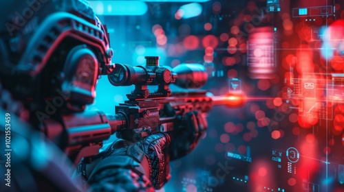 A soldier aiming a rifle with a laser sight in a dark room