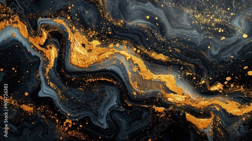 A sophisticated abstract design with gold and black marble textures, highlighting fluid watercolor patterns, white ink splashes, and contemporary oil brush effects on a luxury background