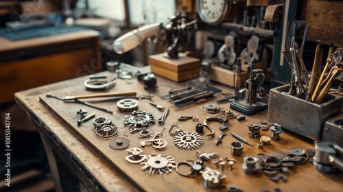A sophisticated watchmaking bench in a compact workshop, Tiny tools, gears