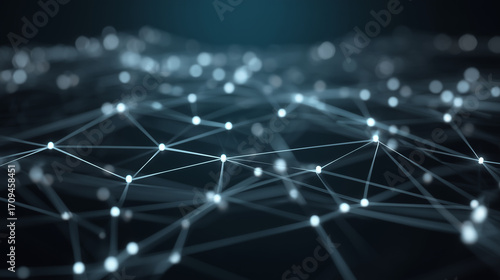 A sprawling digital network graph with glowing nodes and connecting lines, illustrating concepts of global communication, big data, and futuristic technology