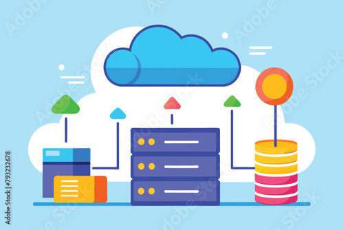 A stack of data being transferred to a cloud storage system, Move data to cloud storage storage, Simple and minimalist flat Vector Illustration