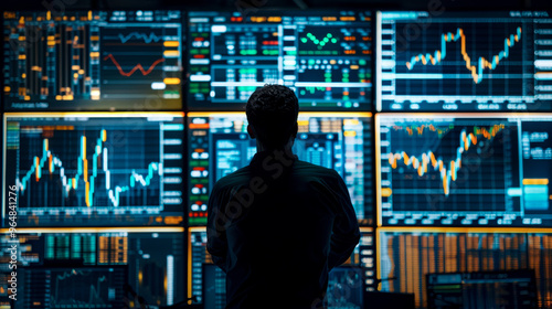 A stock trader analyzing digital candlestick chart, immersed in data and trends. screens display various financial metrics and graphs, reflecting dynamic trading environment.