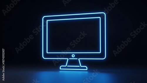 A striking neon blue outline of a modern computer monitor on a dark reflective surface displaying technology s essence