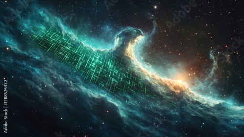 A stunning cosmic scene showcasing vibrant nebulae with a digital grid pattern, symbolizing technology