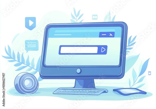 A stylized, illustrated computer interface showing vibrant icons and search bar, symbolizing digital interaction and user interface.
