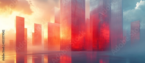 A surreal landscape featuring towering red structures against a misty, colorful sky.