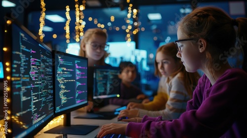 A teacher guiding students through a coding exercise, with branded monitors and crafts like hand-painted coding charts decorating the workspace,