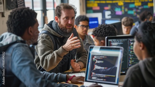 A tech mentor explaining complex coding concepts to a group of eager students, with computer screens displaying intricate code.