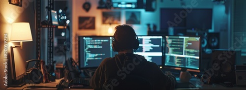 A tech professional debugging code late at night - selective focus on the multiple monitors and intense concentration.