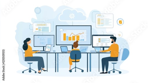 A tech support team troubleshooting cloud system issues, with multiple monitors showing real-time data syncing and cloud server performance in a high-tech office environment