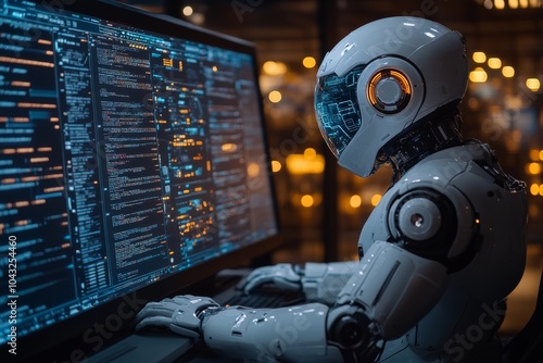 A tech workspace showing a programmer managing intricate automated complexes and AI solutions through advanced software systems. Generative AI