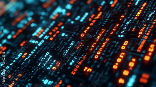 A tech-driven scene with glowing binary code cascading over digital systems. Systems engineering. Programming.