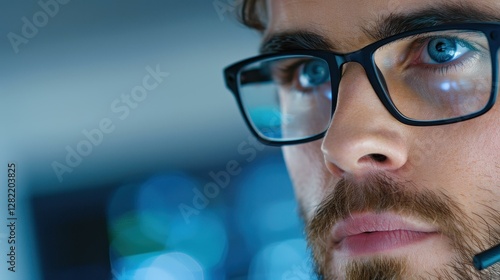 A technical support operator engaged in a call, using a handsfree headset in a busy call center environment.