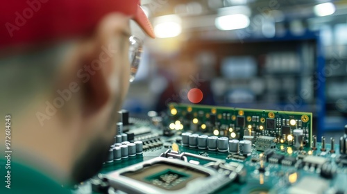 A technician inspecting a circuit board in a manufacturing facility.