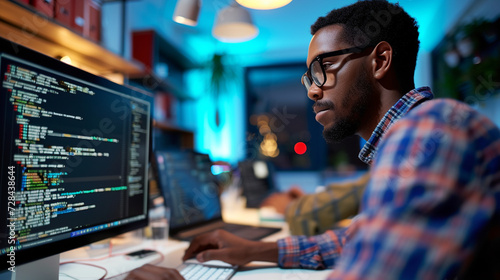 A technology professional working on code in a software development environment, emphasizing programming skills