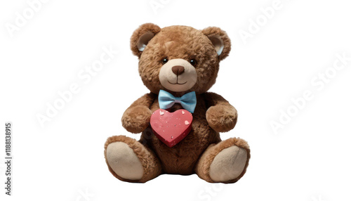 A teddy bear with a cute bowtie, holding a small heart-shaped chocolate box,