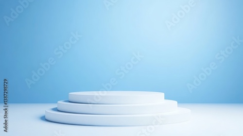 A three-tiered white circular podium sits centrally against a pale blue background. The image is simple, clean, and digitally rendered. Soft, even lighting creates a calm mood. The scene is minimal