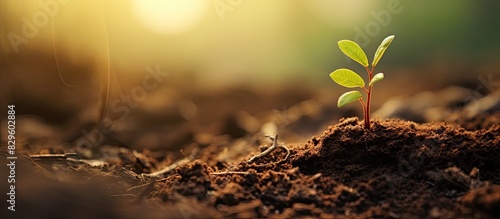 A tiny fresh tree sprout emerging from the soil. Copy space image. Place for adding text and design