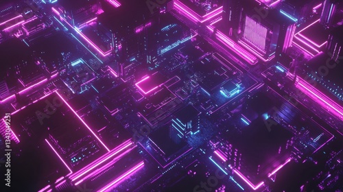 A top-down view of a high-tech gaming station with neon LED strip lights and a custom-built PC with glowing components.