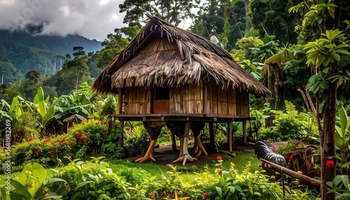 A traditional, elevated dwelling, nestled amidst a lush, vibrant tropical garden, with a rustic thatched roof and supporting stilts, creating a peaceful and serene atmosphere.