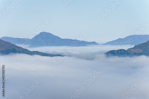 A tranquil dawn where mist weaves through mountain peaks, creating a dreamlike landscape.
