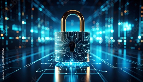 a Transparent digital padlock with glowing lights representing cybersecurity and data
